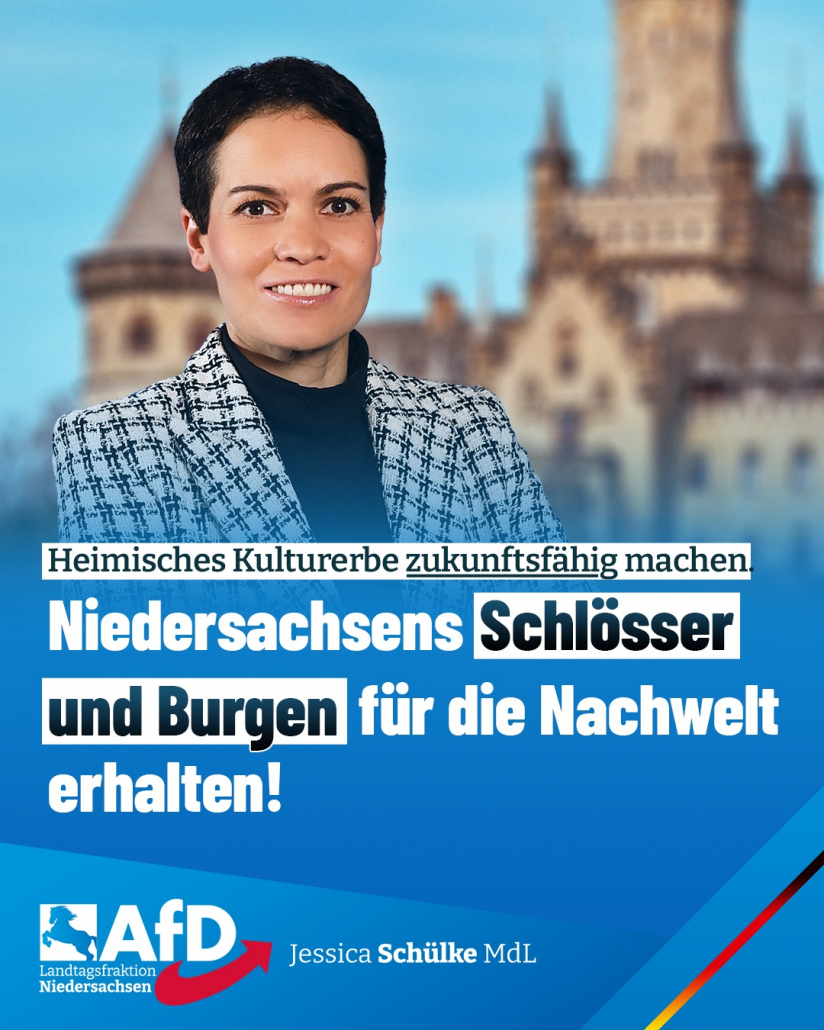 Niedersachsens Schlösser und Burgen aber auch die historischen Park- und Gartenanlagen müssen umsichtig und mit Weitblick verwaltet werden. Die AfD-Fraktion fordert daher die „Errichtung einer zentralen Schlösserverwaltung“. Sie soll unter anderem „wissenschaftliche sowie baugewerbliche Expertise bereitstellen, um Maßnahmen zur Wiederherstellung von Gebäuden, Inneneinrichtungen und Gartenanlagen umzusetzen“. Eine weitere wichtige Aufgabe: „Veräußerte Kunstschätze und verloren gegangenes, bewegliches Inventar der früheren Hofhaltungen zu erfassen und möglichst rückzuführen“ (Drucksache 19/6800).